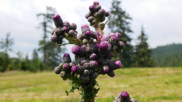 Na beskidzkich, gorczańskich polanach i łąkach można podziwiać kwiatową rewię mody. Jak widać latem modne są jasne fiolety, które bardzo podobają się motylom. Ostrożeń błotny kolcami chroni swe surrealistyczne, bąblaste kształty przed intruzami.