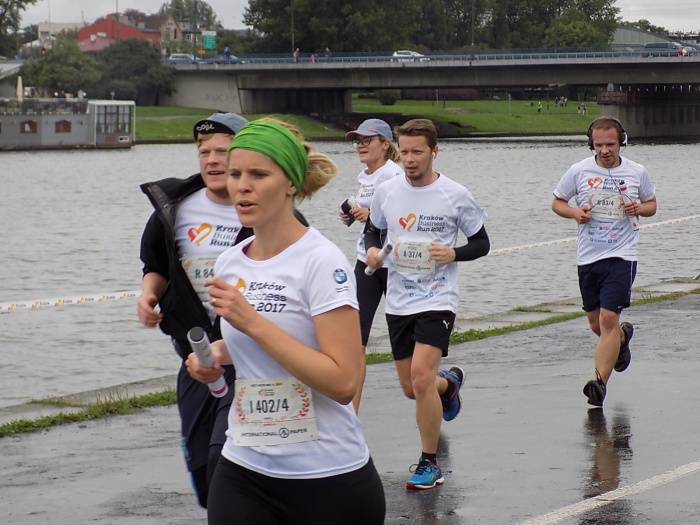 Organizatorzy zapraszali odpowiednio wcześniej uczestników na profesjonalne treningi. Tak więc siła mięśni, siła woli, a nawet ... siła spokoju, pomogła uczestnikom zespołowo pokonywać trasę. Piękną trasę, której pętla otoczyła królewski Wawel prowadząc biegaczy bulwarami nad Wisłą. Nawet niebo się rozpogodziło rozumiejąc wagę chwili.