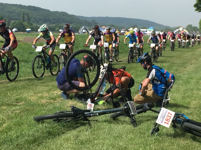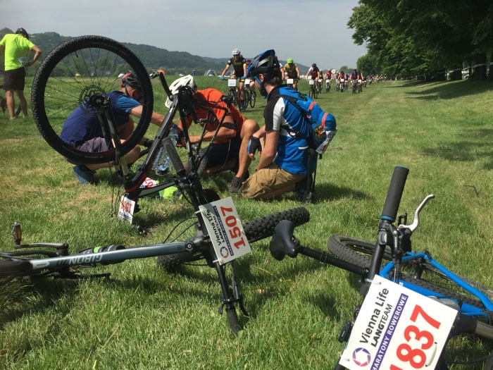 Bywały też awarie sprzętu i koleżeńska pomoc innych zawodników. Wzorcowa postawa fair play. Wszystko skończyło się dobrze, kolarz nr 1506 (ten z awarią), dojechali także niosący pomoc zawodnicy o numerach startowych: 1837 i 1507. Super goście!