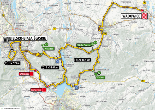 Kolarze wystartują z Wadowic – miasta urodzin Papieża Polaka - o godzinie 11: 25. Na pierwszą Górską Premię w Puszczy Wielkiej powinni dojechać ok. godz. 12:00 . Policja informuje , że droga z Porąbki do Puszczy Wielkiej będzie zamykana około godziny 11:00.